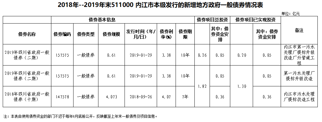 2018年--2019年末511000 內(nèi)江市本級發(fā)行的新增地方政府一般債券情況表