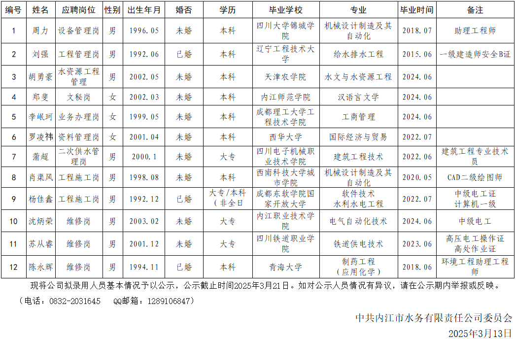 內(nèi)江市水務有限責任公司2025年3月擬招聘人員公示情況表