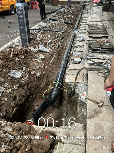 搶修現(xiàn)場,維修人員面對夜間視線不佳、高溫作業(yè)、現(xiàn)場環(huán)境復(fù)雜等多重挑戰(zhàn),爭分奪秒、迎難而上,通宵達旦開展搶修工作。次日凌晨3點58分,維修人員熊弈在工作群里發(fā)布消息:“東興區(qū)政府DN150鋼管因漏點在建筑下方無法維修,已從旁改管繞過漏點,160PE管改管約60米,63PE管改30米,加裝50銅閘閥一只,現(xiàn)已修復(fù)通水?!敝链耍瑩屝薰ぷ鲌A滿結(jié)束,恢復(fù)正常供水。