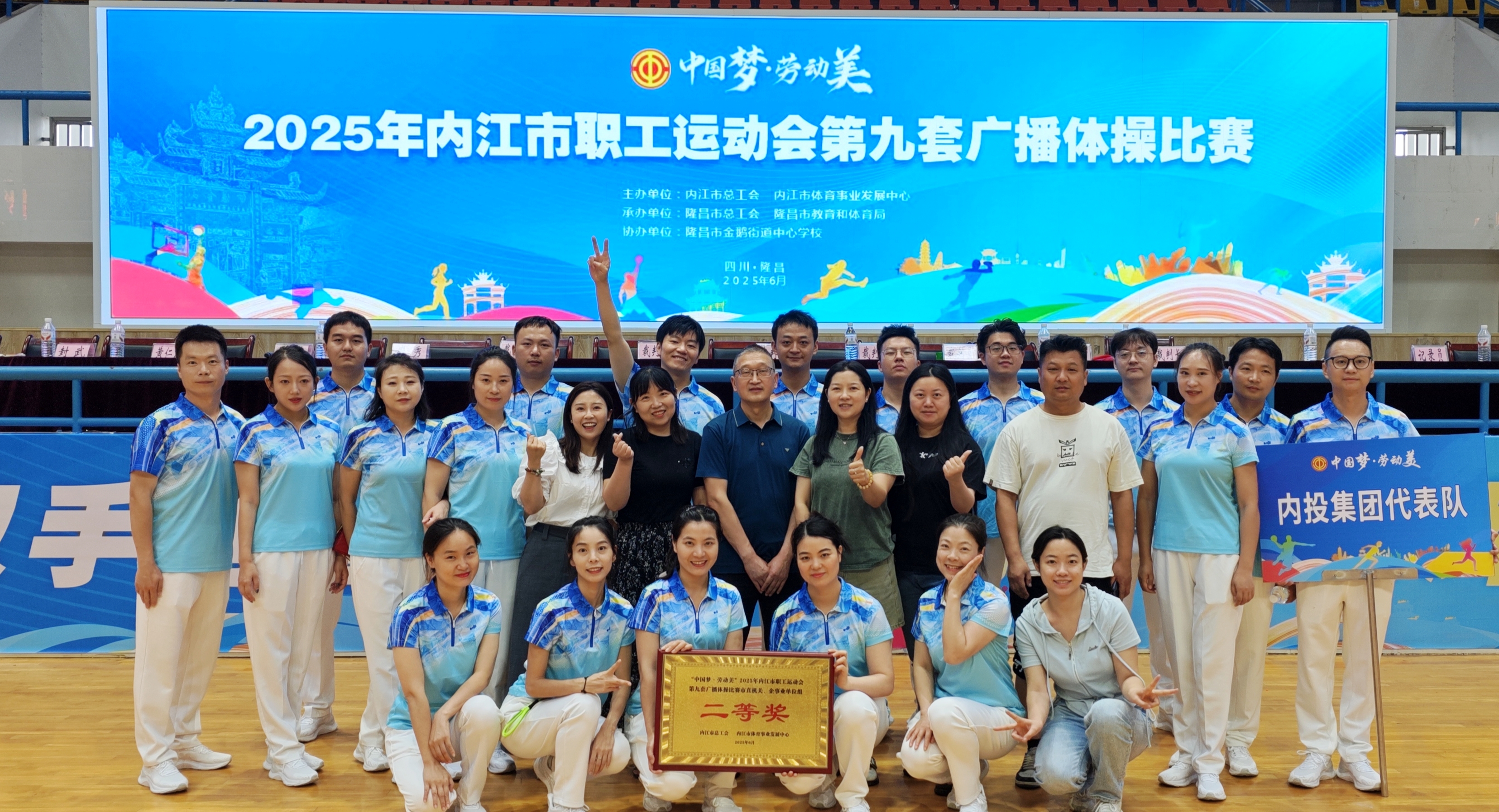 6月21日,2025年內(nèi)江市職工運(yùn)動(dòng)會(huì)第九套廣播體操比賽在隆昌市體育中心成功舉辦。由市水務(wù)公司和云智科技公司聯(lián)合組成的內(nèi)投集團(tuán)公司代表隊(duì)?wèi){借優(yōu)異表現(xiàn),榮獲市直機(jī)關(guān)、企事業(yè)單位組第二名,喜獲二等獎(jiǎng)。